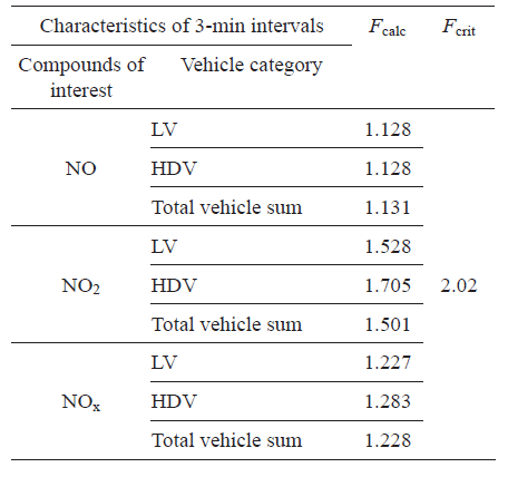 The dependence of the NOx mass concentration on the number of passing vehicles of different categories (LV, HDV, total number of passing vehicles) was determined. ANOVA compares whether or not the controlled factor has a significant effect (Massart et al., 1988), so it was used to compare whether the number of passing vehicles had a significant effect on the NOx mass concentration progress, i.e., a measure of linearity. The interpretation of ANOVA is based on the value of the F-test. The linearity test is done by calculating the F-value and comparing it with the tabulated critical F-test value for a given number of degrees of freedom. The results obtained by ANOVA for the example case (April 13, 2018) are depicted in Table II.