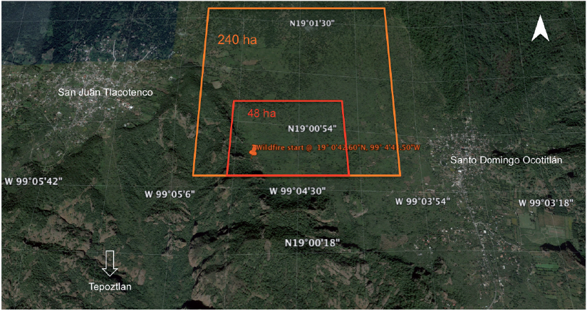 El Tepozteco National Park is a touristic-natural protected area located in the municipality of Tepoztlán, Morelos, Mexico. The wildfire started on April 5, 2016 within the preservation and traditional use area in the park (19º 00´ 42.6” N, 99º 04´ 43.5” W) (Fig. 1). Oak forest was the most affected vegetation. Grasslands, pine-oak forest and deciduous forest were less affected (CONAFOR, 2016). According to the official information (Sánchez, 2016), the wildfire was originated from an agricultural burning that got out of control in the community of Santo Domingo Ocotitlán, on the slope of El Tepozteco mount (Rivera, 2016).