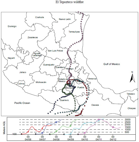According to the simulation with the HYSPLIT software (Stein, 2015; Rolph, 2017), trajectories of the pollutants emitted during the wildfire were advected mainly northwards, reaching the state of Tamaulipas, and southwards to the state of Guerrero (Fig. 3).