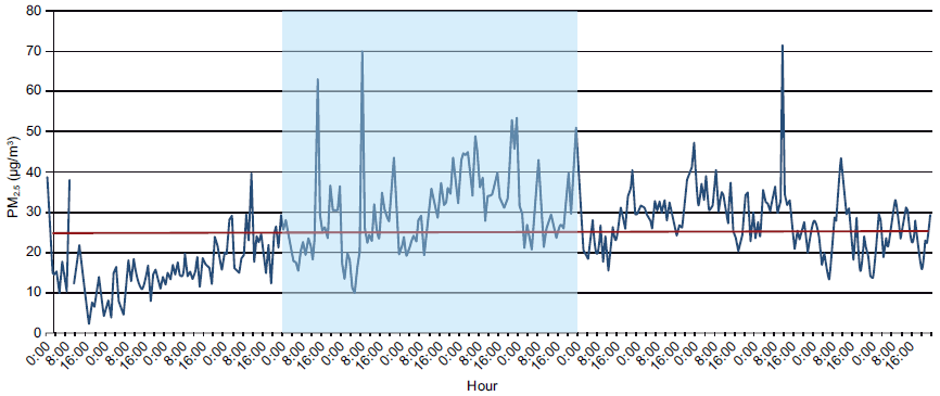 A closer analysis of the advective plumes generated with the trajectory model shows that they did not reach the populated city of Cuernavaca, even though several plumes went eastward. Monitoring data of the Cuernavaca station were used to seek whether PM2.5 mass concentration levels increased significantly during the wildfire period; interestingly, it was found that the values of this variable were high both before and after the wildfire, so there is no statistical significance attributable to the fire for the PM2.5 data (Fig. 4).