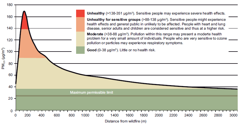 Some of the pollutants that are released during wildfires have global impacts in different categories, spanning from climate change to public health. Aerosols and black carbon, which are part of the breathable fraction of suspended particles (PM2.5), contribute to climate modification in a yet hardly predictable way. The relationship between wildfires smoke and public health is complicated and hard to evaluate in light of the difficulty to assess the exposure of the affected population (Youssouf et al., 2014); it includes deterioration of lung health and enhancement of respiratory disease, increment in the mortality rate of affected communities (Naeher et al., 2010; Morgan et al., 2010; Martin et al., 2013; Keywood et al., 2015), and increment in the incidence of heart disease (Dennekamp et al., 2015; Keywood et al., 2015). The vulnerability of the population to smoke depends on the toxicity of the pollutants (Black et al., 2017), the magnitude of the exposure, the efficiency of intervention measures to reduce the exposure to contaminants, and the lack of an early alarm system, among others (WHO, 2016).