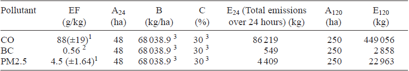 (1)where Ei represents the emissions of pollutant (i), EFi is the emission factor in grams of pollutant per kilogram of burnt fuel (gi/kg), A is the burnt area (ha), B is the biomass concentration (kg/ha), and C is the burning efficiency.
