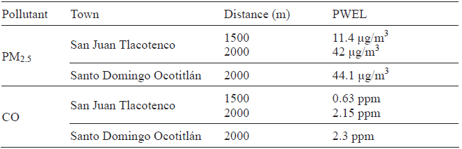In Table II PM2.5 and CO levels from the wildfire in the surrounding settlements are shown. PM2.5 concentrations higher than the WHO daily permissible limit reached San Juan Tlacotenco town, located at 2000 m from the fire and Santo Domingo Ocotitlan town, at 2000 m.