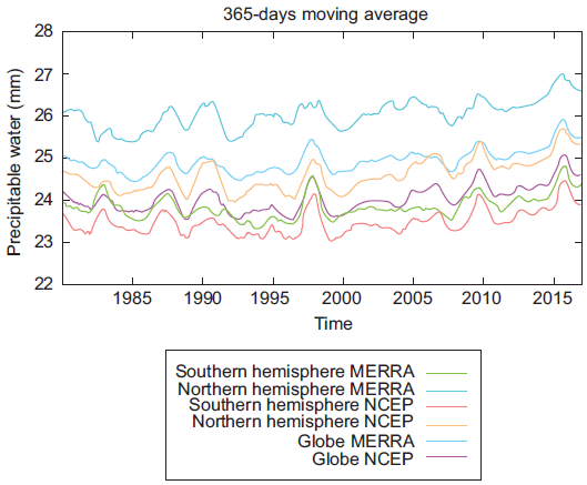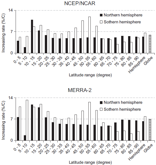 However, no comprehensive studies have yet been conducted to discuss the relationship between extreme precipitable water events and temperature. Previous studies did not give enough consideration to this topic because their main objective was to investigate the relationship of extreme precipitation events with temperature. Although the increase of atmospheric water vapor with temperature is obvious from the CC relationship as well as some previous studies (e.g., Allen and Ingram, 2002; Held and Soden, 2006; Nayak and Dairaku, 2016; Nayak et al., 2017), it is unclear if a relationship between extreme precipitable water events and temperature changes exists and if it follows the CC relationship. How robust is this relationship in both hemispheres and latitude intervals? This study intends to answer these questions by analyzing two reanalysis datasets over the globe for the period 1980-2017 (38 years): (1) the National Centers for Environmental Prediction/National Center for Atmospheric Research (NECP/NCAR) data; and (2) the Modern-Era Retrospective Analysis for Research and Applications, v. 2 (MERRA-2) data.