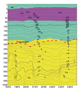 In this section, the vertical variation of the ozone mixing ratio (OMR) during the study period (January 18-25, 1981) is analyzed. Therefore, average values of OMR at each level over the domain enclosing the center of the cyclone are determined at each time during the period of study (Fig. 9). Generally, it is clear that higher values of OMR occur between 20-5 hPa levels reaching their maxima between January 19-20. OMR values gradually decrease below and above the layer between 5-20 hPa. The semicircle (red color) found in the 250-350 hPa layer represents the height of the tropopause at each time of the period of study (Fig. 9). It is clear that during the pre-storm period the height of the tropopause is steady, and there is no variability of OMR above the tropopause, while below the tropopause there is a significant variability in OMR from the surface up to 450 hPa. With the beginning of the growth period, the height of the tropopause decreased, especially during the period from January 19 at 1800 UTC to January 21 at 1200 UTC with the maximum decrease January 20 at 1200 UTC,, and a sharp change in the vertical gradient of OMR was observed between January 19 at 1800 UTC and January 20 at 0600 UTC in the 100-250 hPa layer. This high decrease of the tropopause height was associated with the high deepening of the cyclone and was accompanied by a significant vertical increase of OMR in the troposphere and stratosphere. The obvious significant increase of OMR started at the stratospheric layer on January 20 at 0000 UTC and then was transported to the tropospheric layer, where a striking change in