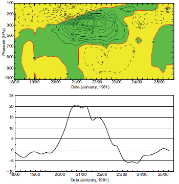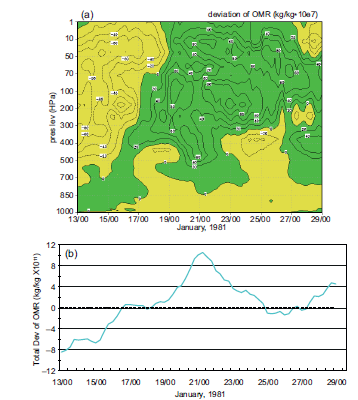 Figure 10a illustrates the time-height variation of the differences of OMR between the average of the domain containing the center of the cyclone at each level and the corresponding monthly average during the period from January 13 to 25. Figure 10a shows that negative values of OMR differences appear above 700 hPa up to the end of the atmosphere during the period from January 13 to 15. The lower level of the negative values raised to 700 hPa on January 18. The higher negative values occurred between the 400 and 10 hPa levels. With the beginning of the cyclone formation and development on January 18, the positive values of the OMR difference appeared