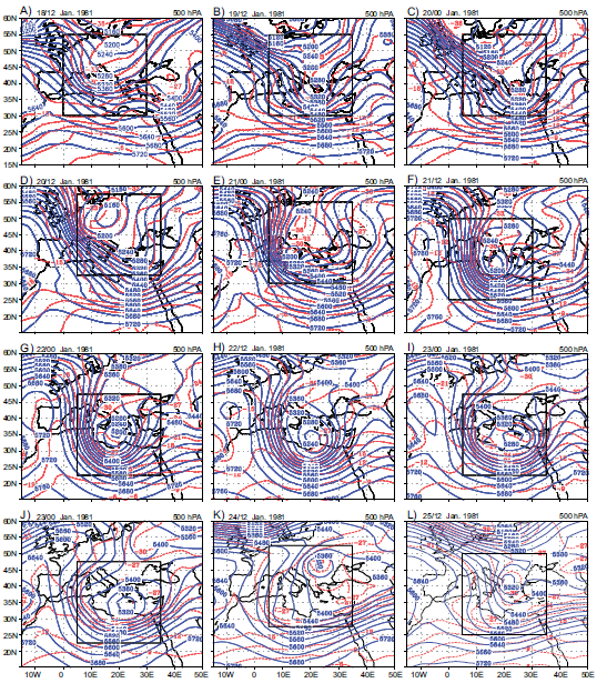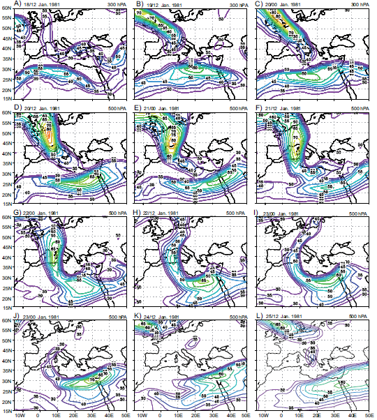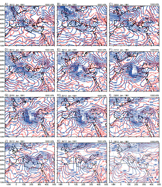 Based on the 1000 and 500 hPa charts the life cycle of our cyclone can be divided as following: the first two days (January 18-19) immediately precede the onset of cyclogenesis and can be termed as pre-cyclogenetic period. The third, fourth and five days (January 20-22) are the growth period, and finally, the last three days (January 23-25) are the decay period. This is a typical case of mid-latitude and Mediterranean cyclogenesis (Karacostas and Flocas, 1983; Lionello et al., 2006; Homar et al., 2007; Kouroutzoglou et al., 2011, 2013z). It has long been recognized that cyclogenesis to the lee of the Alps occurs typically with cold air outbreaks crossing the massif from north or northwest and that the primary influence upon cyclogenesis is orographic (Buzzi and Tibaldi 1978; Gomis et al. 1990). This cyclone evolved between 1200 UTC on January 18-25, 1981, while strong cyclogenesis occurred during 1200 UTC on January 20-22, 1981 over the Mediterranean Sea. Figures 1 and 2 show the 1000 and 500 hPa geopotential analysis for the period from January 18-12 to 25-12, respectively.