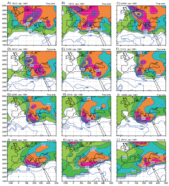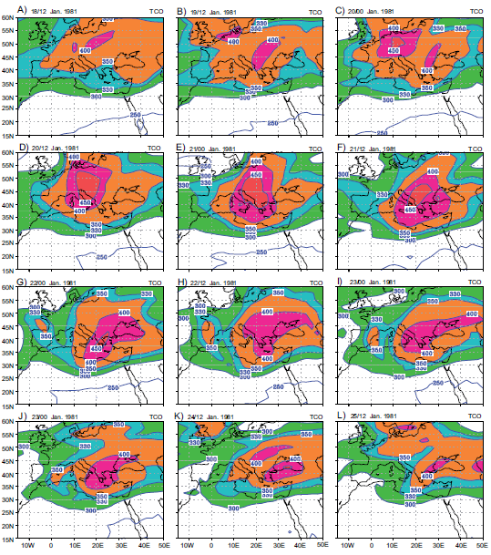 In order to highlight the relation between TCO and tropopause pressure (TP), we present here the horizontal distribution of TCO and TP during the period of study. Figure 5 illustrates the horizontal distribution of the TCO evolution during the period from January 18 to 25. Figure 5a displays the values of TCO on January 18 at 1200 UTC. It is clear that the higher values of TCO are located over Eastern Europe (45-55º N, 10-30º E), over the area of the cyclone of interest. According to Figure 5b, within 24 h (January 19 at 1200 UTC) the high values of TCO propagated slightly southeastward associated with the movement of an upper air trough at 500 hPa (Fig. 2b) and its magnitude increased to 450 DU. After 24 h (Fig. 5d) the values of TCO increased (> 450 DU) and the area of higher values of TCO extended to cover northern Italy and mid-Europe, associated with the formation of a cut-off low at 500 hPa (Fig. 2d). On January 21 at 1200 UTC, the polar jet associated to the western flank of the upper air trough moved southeastward, where its front reached Algeria, and advected the cut-off low southeastward to reach southern Italy on January 21 at 0000 UTC and northern Libya on January 21 at 1200 UTC. The horizontal distribution of TCO in Figure 5d-g illustrates that the period of maximum development and deepening of the cyclone (T’V’ > 0) is associated with higher values of TCO (> 450 DU). This situation continued until January 23 at 0000 UTC, when the main core of higher values of TCO coincided with and associated to the 500 hPa low-pressure center. On January 23 at 1200 UTC (Fig. 5i) the trough had