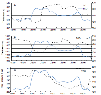 It is known that TCO is linked to synoptic-scale meteorological phenomena. In this section we investigate the relation between total amount of ozone, atmospheric thickness, and tropopause pressure throughout the development of our study case.