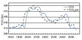 (3)This equation gives valid values of TCO based on the known thickness of ΔZ1 and ΔZ2 and tropopause pressure, especially in the cases of deep cyclogenesis. The short data record (32 values) must temper our results. To obtain more statistically reliable results, long data series (large numbers of cases of cyclogenesis) are required. Figure 8 shows day-to-day variations in the values of observed TCO and its corresponding estimated values arising from Eq. (3).
