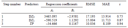 step, and multiple correlation coefficient (r) from a stepwise regression analysis. Table I shows that the total multiple correlations reached 0.94 after using three predictors. This increase in r is associated to a high decrease in RMSE and MAE. The multiple regression equation for predicting values of TCO from the known preceding values of ΔZ1, ΔZ2 and tropopause pressure (TP) can be written as follows: