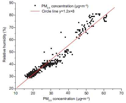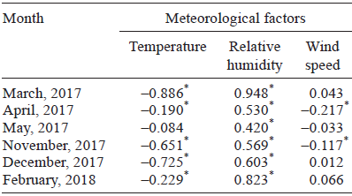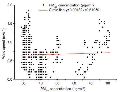 An obvious negative correlation occurs between PM2.5 concentrations and temperature. Atmospheric particulates exhibit continuous Brownian movement. As temperature increases, the movement intensifies and the PM2.5 concentration decreases. A notable positive correlation occurs between PM2.5 concen- trations and relative humidity. As relative humidity increases, the particulates in the air tend to coagulate more easily, which leads to increases of PM concen- tration. However, an obvious correlation was not observed between PM2.5 concentrations and wind speed (Table II).