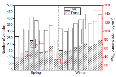 Maina et al. (2018) measured the heavy metal content in PM and the PM2.5 concentrations along the Thika expressway, Kenya, and found moderate to high levels of Cd, Pb and Zn pollution. Longley et al. (2015) monitored the concentrations of PM10, Pb, NOX and NO2 along a main highway in Auckland, New Zealand and set reference points 150 m east and 250 m west of the highway. The average increments in concentrations near the road were 1.1 times, 1.6 times and 1.6 times those at the reference point Figure 10 shows that when the traffic flow increases, the average concentration of PM2.5 in the greenbelts also increases, which is more obvious in spring than in winter, and trucks play a major role in the increase in PM2.5 concentration. The correlation between PM2.5 concentration and traffic flow is stronger in spring than winter.