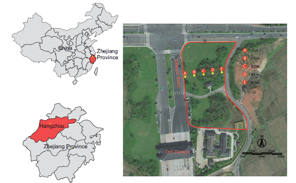 In this study, we chose the greenbelt (30º 22′ 82″ N, 119º 75′ 79″ E) in the idle zone near the Lin’an toll station of the Hang Rui expressway as the sampling area. The closest linear distance from the boundary of the sampling area to the toll station is 50 m, and the sampling area is adjacent to Qianjin road in the west. The other three sides are surrounded by farmlands or forests without any water bodies. The total sampling area is approximately 15 000 m2, and it is composed of sparse forested grasslands (0-15 m) and multistoried mixed forests (15-60 m), the latter of which are typically used for roadside greenbelts in east China.