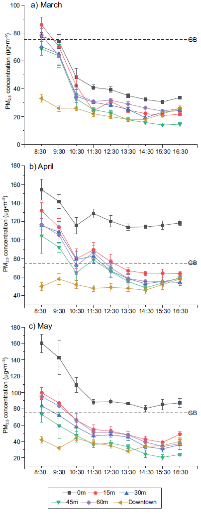 The concentrations of PM2.5 at different monitoring points in spring (March, April and May) basically showed the same variation trend: high in the morning and low in the afternoon (Fig. 2). When the experiment started, the concentration of PM2.5 reached its peak, while it decreased dramatically during 8:30-10:30 LT and then declined slowly, reaching its minimum value during 14:30-15:30 LT. After that, the concentration increased again, which was due to low temperatures, high relative humidity and dust that could not be cleared away in the greenbelts at night, causing the concentration to reach its maximum. With the rising temperature during the day and the decline in relative humidity, the air began to flow faster, and the concentration therefore decreased. After 15:30 LT, the rush hour increased the number of cars and PM2.5 concentration. During March, April and May, the average PM2.5 concentrations in the greenbelts were 32.56 ± 22.51, 77.71 ± 32.11 and 64.15 ± 29.00 μg m–3, respectively. The ranking of concentrations at different monitoring points in the same period was 0 > 15 > 60 > 30 > 45 m. The concentrations from 0-45 m showed a linear decrease. However, if the distance of the greenbelt was over 45 m, the concentration would increase; the reasons why are explained here. The position at 0 m was adjacent to the road without roadblocks and was thus most affected by automobile exhaust and dust, resulting in the highest PM2.5 concentration. The position at 15 m was an open lawn, which could, to some extent, retain PM2.5, though not much. The plant density from 30-60 m was higher, and the multistoried mixed forests could effectively adsorb PM2.5. The yellow line in Figure 2 represents the PM2.5 data from the national environmental