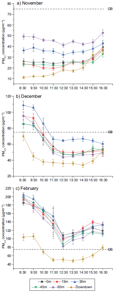 Figure 3 represents the changes in PM2.5 concentrations in the greenbelts during winter (November and December 2017, and February 2018), which shows an apparent pattern of two peaks and one valley and is different from the variation trend in spring. PM2.5 concentrations were at a maximum when the experiment began and then declined to the minimum around 12:30-13:30 LT. After 14:30 LT, concentrations rose again and then reached a peak during the day due to rush hour. The average concentrations during November, December and February were 33.56 ± 9.34, 60.78 ± 17.67 and 124.71 ± 43.19 μg m–3, respectively. However, the ranking of concentrations at different monitoring points in the same period revealed some differences. The ranking in November was 60 > 30 > 0 > 45 > 15 m, while in December and February it was 30 > 0 > 15 > 60 > 45 m. The reasons can be illustrated as follows. In November, the leaves of deciduous plants in the greenbelts began to fall, which made it easier for air to flow and for vehicle exhaust and dust to accumulate in the greenbelts; therefore, the concentration at 60 m in the multistoried mixed forests was the highest. As the position at 0 m was the source of pollution, the concentration was relatively high. In December and February, however, due to the highest plant density at 30 m and a large number of evergreens, PM2.5 from the road could be effectively adsorbed; therefore, the concentration at 30 m ranked the highest. In February, because of the low temperature near the ground, low wind speed, and less rainfall, the weather tends to be hazy, with a higher overall concentration of PM2.5. Compared with the downtown area, the average PM2.5 concen- tration at the sampling point was higher, which was consistent with the situation in spring.