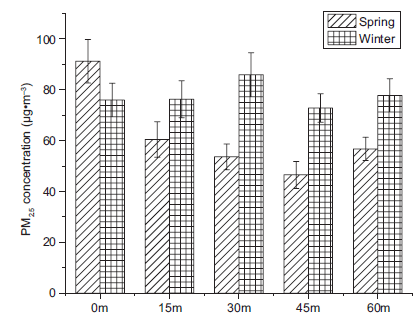 Except at 0 m, the concentrations of PM2.5 at the other four positions were higher in winter than in spring. In spring, the PM2.5 concentration from 0-45 m showed a linear decreasing trend, but when the distance was larger than 45 m, the concentration increased instead. In winter, PM2.5 accumulated at 30 m and showed a high concentration because rainfall in spring was 2.5 times that in winter in Hangzhou. Relative humidity in the multistoried mixed forests in spring was higher, which enabled the deposition of particulates. In winter, however, temperature and air pressure decreased, and wind speed was higher than in spring. Since the sample area in this study was relatively small, the concentration of PM2.5 was not significantly correlated with wind speed. The PM2.5 concentration at 30 m was the highest in the greenbelts because multistoried forests had the greatest density due to the large number of evergreens, which can effectively retain PM2.5 from the road.