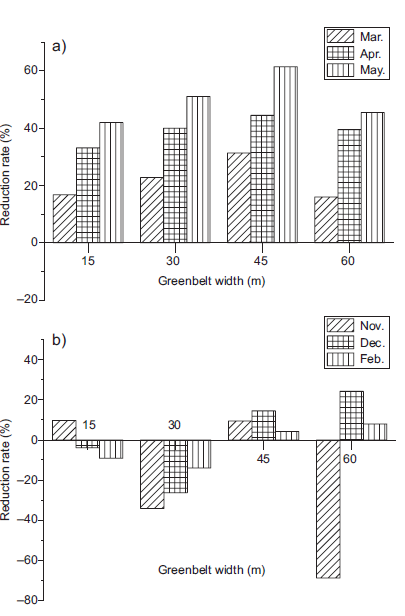 area of the leaves increases and the contact area with atmospheric particulates increases, thus PM2.5 can be more effectively retained. The reduction rate of PM2.5 in spring follows the ranking May > April > March; in terms of distance, the rank is 45 > 30 > 60 ≥ 15 m. In winter, because of the influence of external factors (meteorological factors, structure of plant commu- nity, etc.) on the reduction rate, the concentration of PM2.5 increases. The reduction rate at different distances varies greatly. In November, the rank is 45 > 15 > 30 > 60 m, while in December and February, it is 60 > 45 > 15 > 30 m. The reduction rate at 60 m differed greatly, which can be attributed to factors such as the canopy density of the plant community, planting density and degree of porosity. According to the theory of diffusion and deposition effects, the effectiveness of lowering the concentration of PM is related to the distance from the pollution source. Deposition is higher when a higher vegetation barrier volume is placed closer to the source region, while dispersion is stronger when the vegetation barrier is placed farther from the source region (after the distance to maximum concentration). Therefore, with the increase in thickness and height of the vegetation barrier, the efficiency of reducing pollutants can also be improved. After analyzing PM2.5 retained by the greenbelts at different ranges in spring and winter, the reduction rates at 45 m were found to be the highest in both seasons. In spring, the reduction rate increased with increasing distance from 0-45 m and then declined at 60 m; in winter, there existed some hysteresis, and the reduction rate at 60 m was positive (except in November). Bao et al. (2016) studied the ability of protection forests outside a city park to reduce PM2.5 and found that if broadleaved tree and grass forests were within the range of 15-45 m, the concentration of PM2.5 tended to decrease, and the concentration increased at 60-75 m.