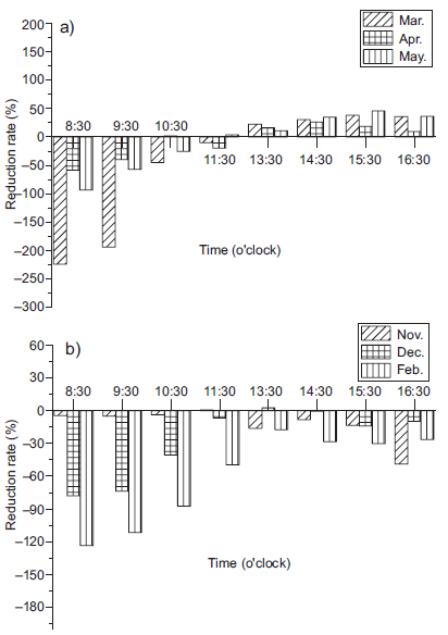 The reduction rate was calculated—with 12:30 LT as the reference time—after comparing and analyzing the reduction patterns of PM2.5 at 45 m at different time intervals. Figure 6 displays the variation in PM2.5 during spring and winter. The reduction rates in spring in the morning were all negative, especially in March, when the rate was the lowest before 9:30 LT,