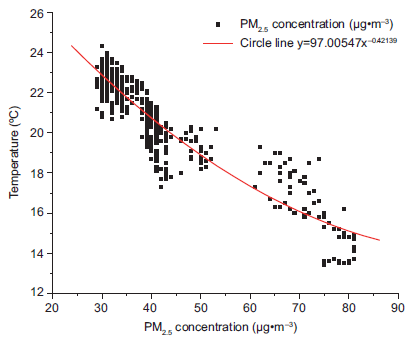 Temperature. Studies have shown that PM2.5 concentrations decrease as temperature increases and vice versa. A fitting analysis was conducted between PM2.5 concentration and temperature to better determine the correlation between them. An inverse proportional function can be obtained, i.e., y = 97.00547x–0.42139 (p < 0.0001) (Fig. 7).