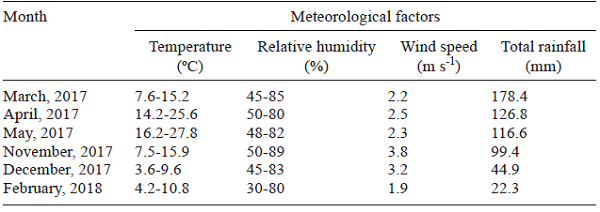 Located in the subtropical monsoon region in the Northern Hemisphere, Hangzhou is characterized by four distinct seasons and abundant rainfall, with an annual average temperature of 17.8 ºC, an average relative humidity reaching 70.3%, an annual rainfall amount of 1454 mm, and annual sunshine as high as 1765 h. Spring is warm, with high relative humidity, breezy weather, and frequent light rain that lasts for a long time, while winter is featured with low temperatures and less rainfall. Table I shows the monthly meteorological data in the region of the sampling point during the research period.