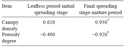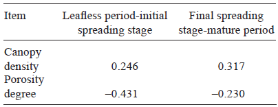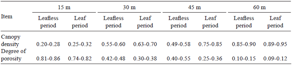 correlation analysis comparing PM2.5 concentrations with the canopy density and porosity degree from 0-45 m is presented in Table V. The results revealed that the PM2.5 concentration was strongly positively correlated with the canopy density and negatively correlated with the porosity degree when the leaves were completely mature. During the leaf- less and spreading periods, there was no obvious correlation between the PM2.5 concentration and the canopy density and porosity degree, which shows that the structure is not a major factor influencing the variation in PM2.5 concentrations during these two periods. The fact that the PM2.5 concentration is not strongly correlated with the canopy density and porosity degree in the greenbelts between 0 and 60 m in the mature period indicates that there is a threshold value that must be reached. Studies show that when the canopy density is between 0.75 and 0.85 and the degree of porosity is within 0.3-0.4, theability of plant communities to retain PM reaches itsmaximum (Yin et al., 2007; Bao et al., 2016). Thisconclusion is similar to our results. Liu et al. (2015)claimed that vegetation could reduce the PM2.5 in air effectively, and this ability could reach its peak whenleaves spread out fully.