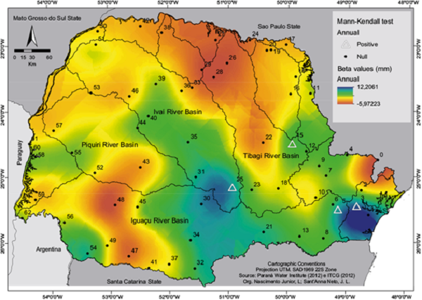 The spatial distribution of these stations suggests a concentration in the extreme west of the area, and another pattern that occurs in the northeast to central-south sectors. The values of β follow this pattern, indicating an increase in precipitation in the eastern sector and part of the southern sector of Paraná State, while negative trends occur below the Tibagi and Ivaí basins.