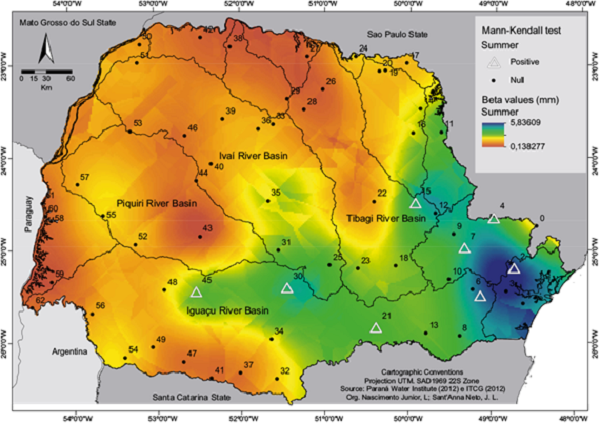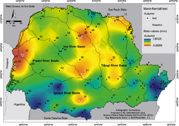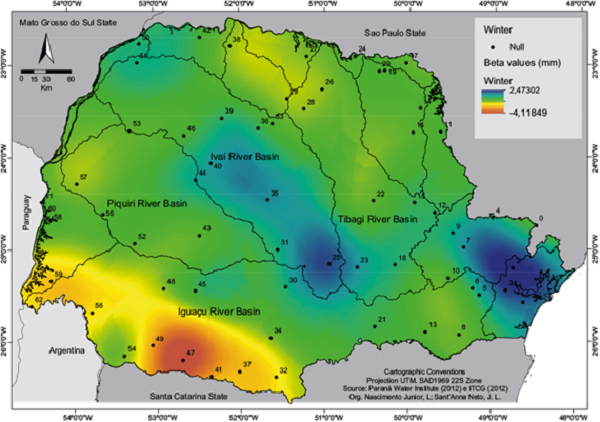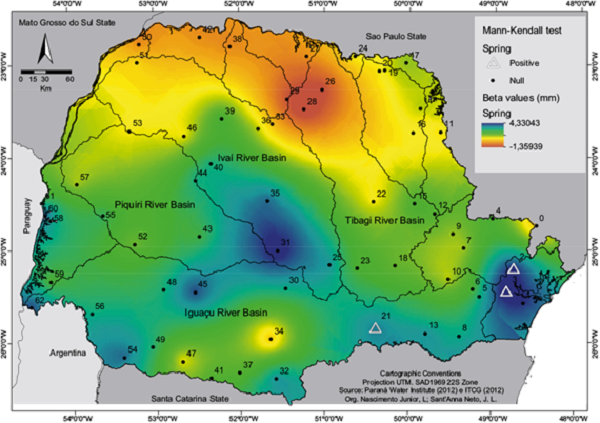 In winter, negative values occur in the extreme southwest of the state, importantly in the west of the Iguaçu River basin and moderately in the north of Paraná State; conversely, they are strongest in the coastal sector and below the Ivaí river basin. According to the Mann-Kendall test, significant trends were not present during the winter (Fig. 5).
