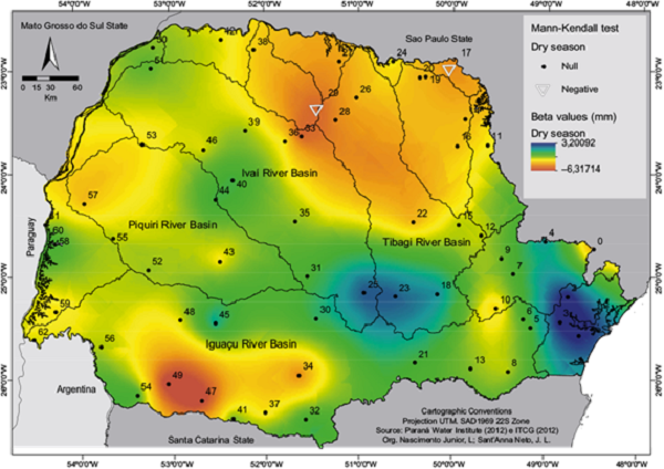 Rainfall trends in the dry season synthesize the sign of gradual decrease in precipitation in the north and west of Paraná State, with two historical series demonstrating a significant negative trend: Cambará and Arapongas. Positive β values occur slightly in the central-south of the state and in the coastal sector (Fig. 8).
