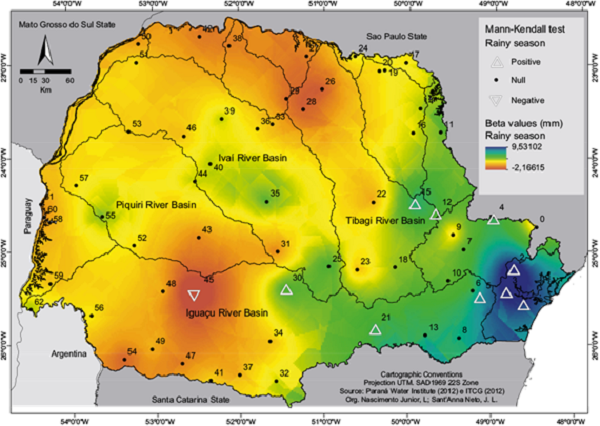An important group of studies (Nascimento Jr., 2013; Carmello and Sant’Anna Neto, 2016; Nascimento Jr. and Sant’Anna, 2016; Ely and Dubreuil, 2017; Terassi and Galvani, 2017; Ely, 2019) has shown evidence that trends and changes in rainfall patterns in Paraná are mainly observed with the increase of rainfall during the humid period (which coincides with summer and spring), especially in the southern sector of the state.