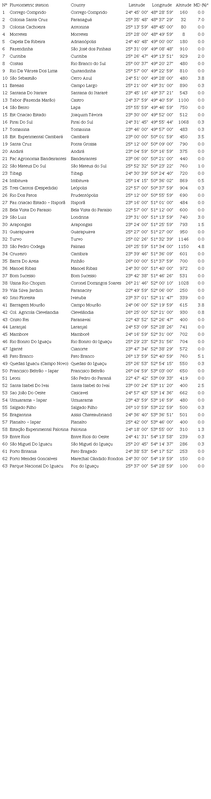 Water Institute of Paraná. 2011. Network of rainfall stations. State Water Resources Management System, State Secretariat of the Environment, Government of Paraná. Brazil.