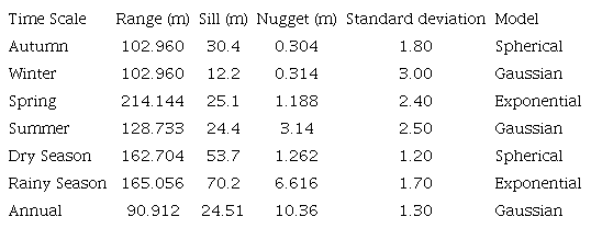 It was noted that spring and the rainy season are the most difficult periods to model considering the range, sill and nugget values. This occurs precisely because the rains in both periods can be local (convective) and regional (frontal systems). This impacts directly the spatial dependence of rainfall values at the humid period in tropical areas.