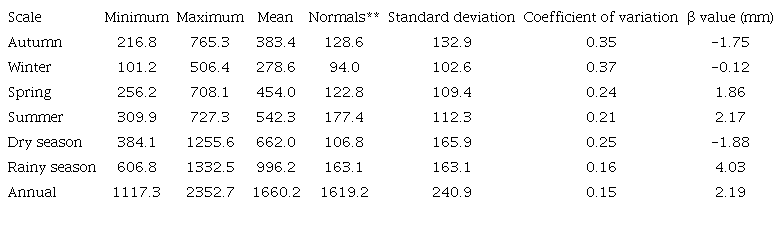 Table III presents values of the historical series for autumn, winter, spring, summer, the dry season and the rainy season, as well as annual scales, together with s descriptive statistics, in order to display information about the distribution of rainfall data.