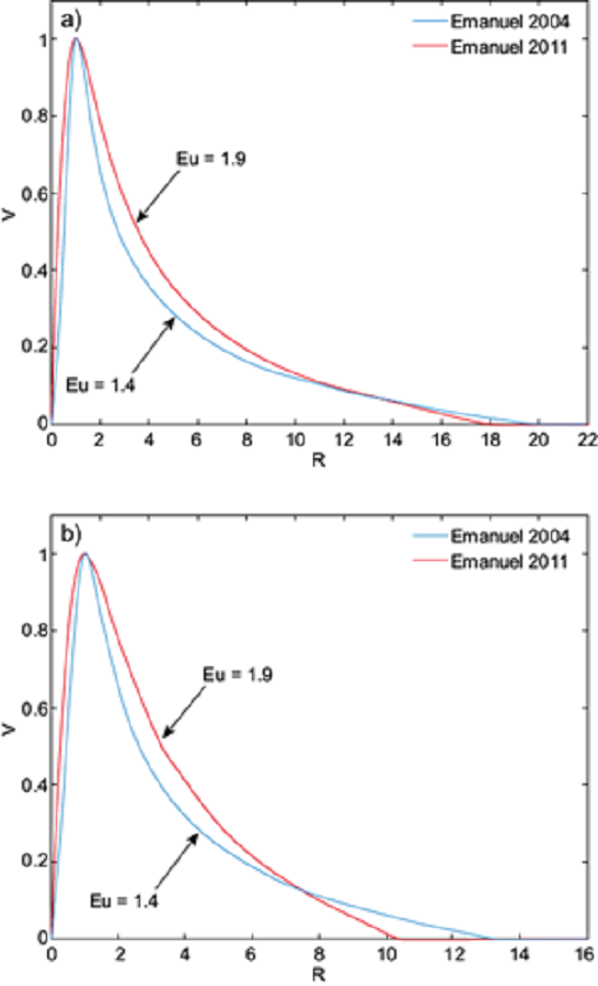 Figure 1 shows the tangential wind velocity profiles and the numerical calculations of the Euler number for two different Rossby numbers, Ro ≈ 80 and Ro ≈ 26, which could represent an intense and a weak storm. The computed Euler number resulting by the use of the first wind velocity profile (Emanuel, 2004) is Eu =1.4, whereas Eu =1.9 is obtained for the second case (Emanuel and Rotunno, 2011).