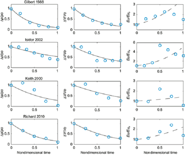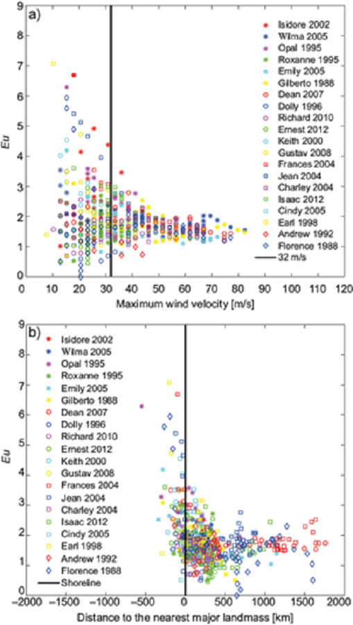 In these expressions, ∆p is the overall pressure difference, v is the maximum velocity, ∆p0 , v0 and Eu0 are the overall pressure difference, maximum speed and Euler number when the hurricane reaches land, t the time elapsed after the storm reaches land, and ξ and γ are decay constants. The main limitations of course are the missing data to evaluate the pressure difference. At landfall, there were many missing records. Even when there are different methods to interpolate and fulfill the missing data of the dataset, this may introduce an important bias in the analysis of the Euler number. Hence, missing data were just discarded.