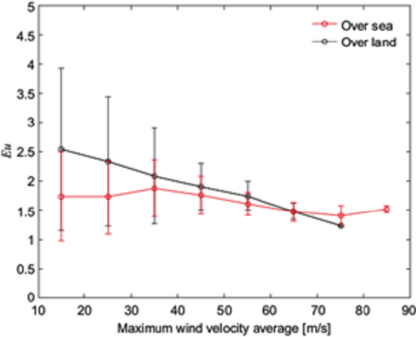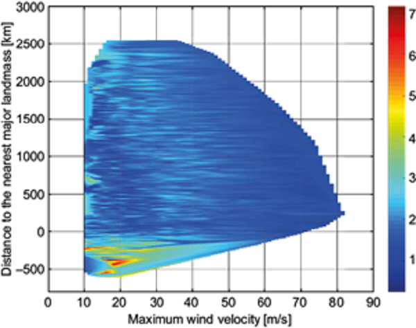 The same analysis was performed for all records contained in the extended best track database. In figure 4, the Euler number has been plotted as a function of both the maximum velocity and the distance to the nearest land portion. Here, the behavior described above for the Euler number is more evident. Over sea, when the maximum wind velocity is greater than 30 ms-1, the Euler number is conserved between values of 1 and 3, while over land its values tend to increase with decreasing maximum wind velocity, taking values between 3 and 7. This trend is also reflected in the average of the data. In Figure 5, the averages of the Euler number are recorded in intervals of 10 ms-1. It is remarkable that the average in each speed interval tends to oscillate with a maximum standard deviation of 0.7, about the mean value of 1.8, while over land the average Euler number for each speed range shows a linear increase with decreasing speed and much larger variations.