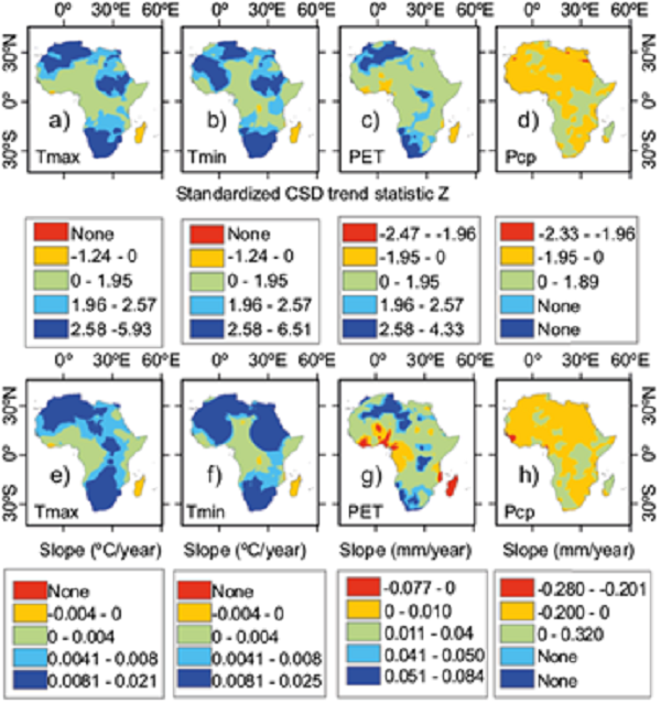 Keywords: climate variability, temperature trends, precipitation trends, evapotranspiration trends, seasonal CSD trend, hydroclimate of Africa.