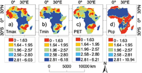 Temperature and PET variability was low in the equatorial climate. Areas with high variability in temperature included Mozambique, Egypt, Mauritania, the Western Sahara, and the Lake Victoria region. Pcp variability was high across the continent. However, Sahara and Namib-Kalahari deserts were characterized by low Pcp variability.