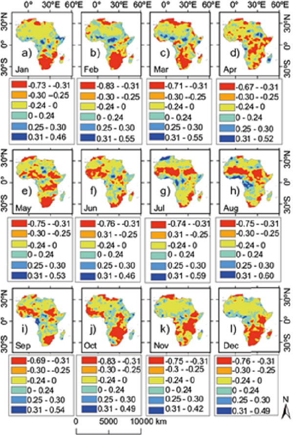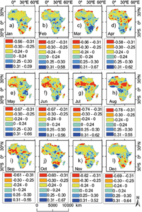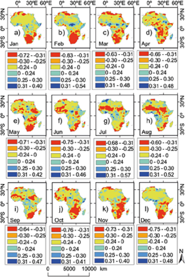 Results for the correlation between Pcp subtrends and those of Tmax, Tmin and PET can be seen in Figures 4, 5, and 6, respectively, in which the values 0.25 and 0.31 are the thresholds for rejecting H0 of no correlation at α = 0.01 and 0.001, respectively. From May to September, a strong negative correlation between Pcp and Tmax (Fig. 4e-i), PET (Fig. 6e-i) and Tmin (Fig. 5e-i) was confined to the region between 4-21º N. In southern Africa (generally south of 8º S), a strong negative correlation between Pcp and Tmax was exhibited from January to March, May, October and December (Fig. 4a-c, e, j, l). A strong negative correlation (p < 0.001) between Pcp andTmax or Pcp and PET was observed in the February, March, October, and November data, especially along the coast of the Mediterranean Sea. A strong positive correlation between Pcp and Tmin of March (Fig. 5c) was observed in Mozambique, Zambia and Zimbabwe. However, in October (Fig. 5j) and August (Fig. 5h), the strong positive correlation between Pcp and Tmin was mainly confined to South Africa and the coastal areas along the Gulf of Guinea, respectively. A positive correlation between Pcp and Tmax (Fig. 4g-h) as well as Pcp and Tmin (Fig. 5g-h) during July and August was observed along the Gulf of Guinea, as well as the north of Morocco and Algeria. Over East Africa, a strong negative correlation (p < 0.001) between Pcp and Tmax was osberved in April and November (Fig. 4d, k). In general, in January and February, areas with a strong correlation between Pcp and temperature or PET were far south of the equator. From March through April and May to June, in areas where H0 was rejected (p < 0.001) for a strong negative correlation the spatial coherence decreased consistently, but with increasing shifts northwards as far as 14º N. Slightly past the middle of the year (July or August), a band of strong negative correlation was found in the Northern Hemisphere as far as 20º N. The described shifts in areas with strong correlation between Pcp and temperature were more evident for Tmax than for Tmin.