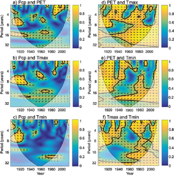 The strength of the Pcp covariation with Tmax, Tmin or PET was inconsistent through time. The strongest coherence between Pcp and PET occurred at multiple scales (2-5 years). Pcp cycled in anti-phase with PET from 1985 to 2005. The strongest coherence between Pcp and Tmin (or Tmax) existed at multiple scales (6-8 years). A strong coherence of Pcp with Tmax and Tmin was observed over the periods 1901-1935 and 1901-1925, respectively.