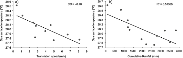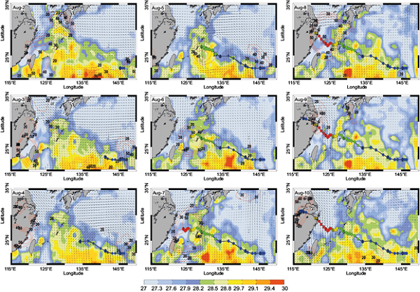 This process can be explained as follows: SST deviations clearly indicate there is an increase of 0.3 ºC; then, SST decreased 0.16 ºC on the next day, and 1.24 and 0.1 ºC on the second and third day, respectively, after the typhoon landfall. Later on, SST slowly increased. The intensity of a typhoon is higher when it is located in the coastal area, since the strong cyclonic winds produce an upwelling leading to SST cooling. After the typhoon landfall, strong wind prevailed for one more day (Table I) (i.e., August 8); then wind decreased gradually leading to mixing over the coastal water. SST cooling occurred even after the landfall of the typhoon. Maximum rainfall was observed at the time of the typhoon landfall over the coastal area, however it was higher after landfall. SST diminished due to runoff from land towards the coastal area. The ocean and air-sea interaction processes over the coastal area explain SST cooling.