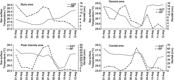 SST and rainfall variations in the chosen areas and the influence of the typhoon are presented in Figure 2. Differences in translation speed, intensity (wind speed and pressure), and SST variations in different areas during the typhoon period are given in Table I. Before cyclogenesis (on August 1) mean temperature over the study area was 28.9 ºC, which is higher than the previously identified temperature (26.5 ºC) for cyclogenesis. The typhoon formation occurred over a narrow time span of 48 h, which is a favorable condition for the formation of typhoons and remained around 28.5 ºC throughout the typhoon period. Overall, temperature decreased by 0.32 ºC over the study area; however, the peak intensity and coastal areas experienced higher cooling than the genesis and study areas. Haikui’s peak intensity occurred on August 7, and the observed SST cooling was -0.54, -1.08, and -1.85 ºC on August 7, 8 and 9, respectively. Due to a higher wind speed and low translation speed (2.46 ms-1) of the typhoon over coastal area, the decrease in SST was of 1.9 ºC. Deepening and cooling of the mixed layer occurred when translation speed was below 3 ms-1 (Wu and Chen, 2012). SST cooling has an inverse relation with translation speed and precipitation. Typhoon translation speed and precipitation over the peak intensity and coastal areas were more prominent during the typhoon passage and before landfall.