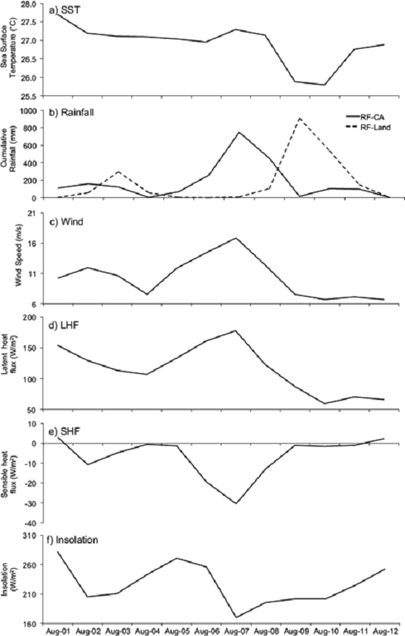 Figure 4 illustrates the variation of parameters over a coastal area during the typhoon period. During the typhoon passage insolation reduces due to an overcast condition. Since peak intensity at a coastal region occurred on August 7, LHF increased to 71 Wm-2 in four days, attaining its peak value (177.6 Wm-2), and SHF decreased to -30.6 Wm-2 (heat transfer occurs from atmosphere to ocean surface). Over the coastal region, SST cooling took place slowly before the typhoon landfall, due to higher latent heat from evaporation released to the atmosphere, higher typhoon intensity (which produced strong upwelling), and heavy rainfall (62.5 mm) leading to cooling of the SST. However, the maximum cooling befell two days later. After the typhoon landfall, heat transfer occurred from the atmosphere to the sea surface (negative SHF), LHF decreased due to a decline in wind speed and SST normalized. Insolation and SHF increases, as well as LHF decrease, led to a gradual increase in SST. This explains that net heat flux has an impact on SST cooling and warming, and also has a good positive relation with SST (CC = 0.74). On the left side of the typhoon after landfall there was a lag in SST cooling and cool weather persisted for a few days due to rainfall and air-sea heat exchange.