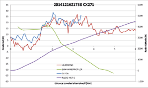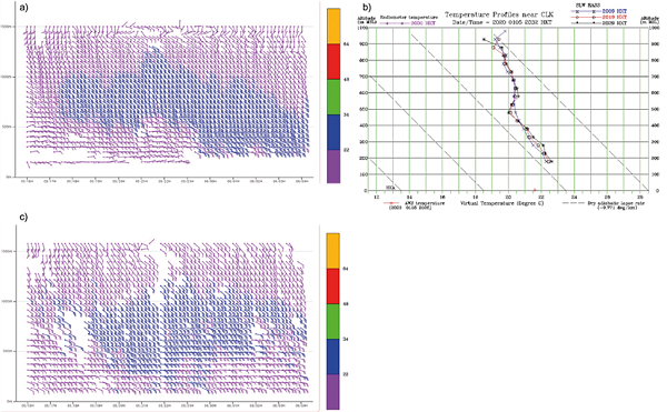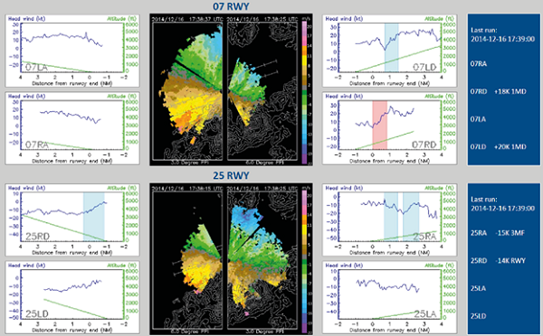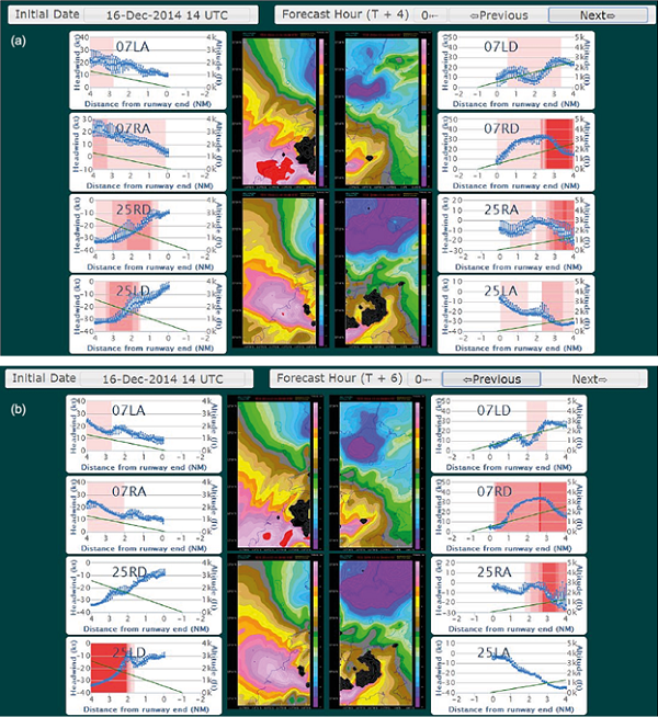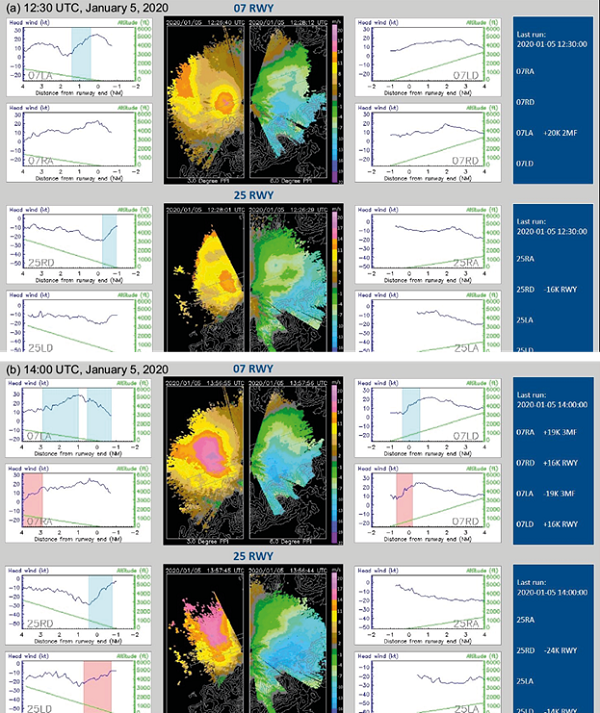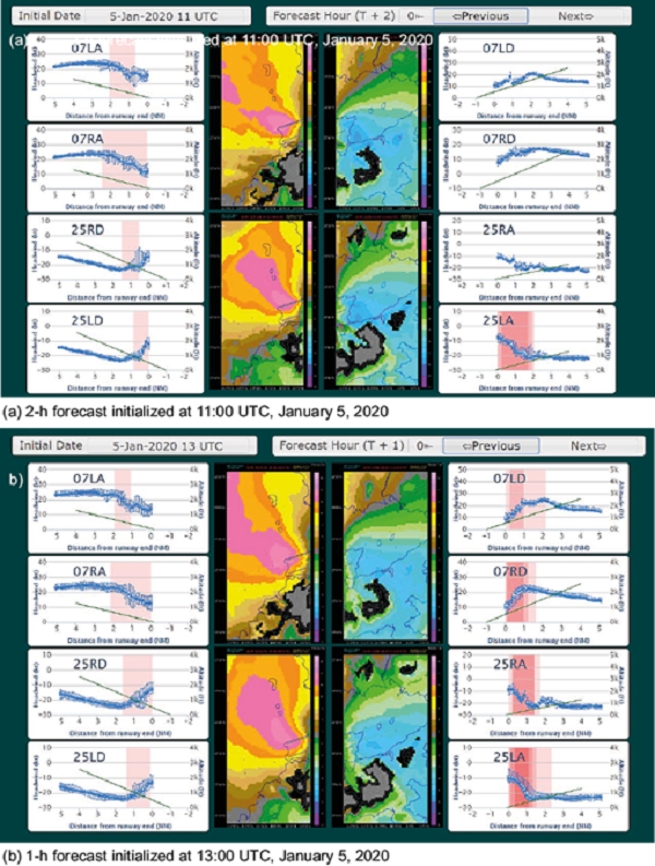 An outbreak of intense northeast monsoon occurred on December 16, 2014. From the surface synoptic charts (Fig. 8, b), densely packed surface isobars appear over southern China. The northerly winds remain strong in the next morning. This is a typical situation for the occurrence of cold weather in Hong Kong during winter.From the radiosonde ascent measurements at 12:00 UTC on December 16, 2014 (Fig. 9a) and the next morning (00:00 UTC on December 17, Fig. 9b), a low-level jet occured at about 1000 masl with a magnitude of 13 to 18 ms-1. Several weak temperature inversions (around 2°) appear at about 500 and 1000 masl at 12:00 UTC on December 16, 2014, which were ground-based on the next morning. There are several mountains upstream HKIA in the northeast to north direction, though much lower in height (about 300 m). Terrain disruption may play a role in the occurrence of turbulent airflow over HKIA, but the low-level jet could cause itself significant headwind changes to aircrafts.A typical headwind profile over that night is given in Figure 10. For 07RD, there is a single peak structure associated with the jet and significant windshear is expected as the aircraft departs from the airport. In fact, between 17:00 and 22:00 UTC on December 16, 2014, a total of six aircrafts reported encountering a windshear over 07RD, at a height between 1000 and 2000 feet and wind changes of +20 (gain) to -15 (loss) knots. Flight data are obtained from aircrafts as shown in Figure 11, where it can be seen that the headwind profile between LIDAR and the aircrafts is very consistent. On the other hand, while displaced from the runway direction a bit for the wind profiler at Siu Ho Wan, the headwind profile is not consistent with observations. As a result, windshear alerting requires headwind measurements right at the location of the flight path. A distance away from the flight path may not be sufficient to capture the headwind changes encountered by the aircraft.The high-resolution NWP model again does a good job in capturing the windshear associated with the low-level jet. Some typical forecasts of the model are given in Figure 12. It can be seen that simulated and actual LIDAR PPI images are very similar. Moreover, over 07RD, the simulated headwind profile captures the single peak structure, and the model is sufficient to produce realistic windshear alerts from the aircraft 4 to 6 h ahead.