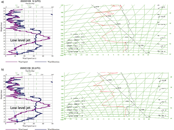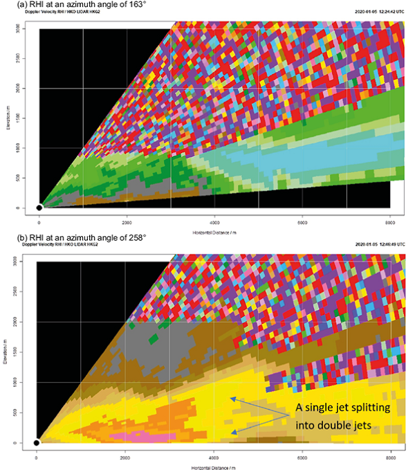 Synoptically on that day, a ridge of high pressure over the southeastern coast of China brought strong easterly winds to Hong Kong (Fig. 1a). Windshear reports were received from two aircrafts, one at 12:30 UTC arriving at HKIA on the 07L runway at a height of 500 feet with a headwind gain of 15 knots. Another was reported over runway 07RD at 14:00 UTC, 500 feet height and a 20 knots headwind gain. There was another turbulence report from a departing aircraft from 07RD at a height of 1000 feet (about 1 nautical mile from the runway threshold), which encountered moderate turbulence. We mainly focused on the two windshear reports, though turbulence also occurred because of the terrain-disrupted easterly airstream caused by the mountains south of HKIA. Figure 1 b, c shows the surface wind distributions near HKIA at the time of the two windshear reports. It can be seen that the winds were rather smooth over the runways and the surrounding sea. Based only on ground-based wind data, the occurrence of a low-level windshear could not be suspected. The only hint was a strong to gale force wind over the mountain top, which indicates there was a low-level jet within the atmospheric boundary layer and the wind could be disrupted over the HKIA region due to mechanical turbulence from the mountains at the south of the airport.The low-level atmospheric structure is also revealed in the radiosonde measurement at King’s Park at 12:00 UTC, January 5, 2020 and at 00:00 UTC on the next day (Fig. 2a, b, respectively). A jet of about 13-15 ms-1 at a height of about 1000 m can be seen in both measurements. At roughly the same height, temperature inversions of 3º to 5º can be analyzed in the thermodynamic diagrams. The jet and the temperature inversion appear around the height of the mountains to the south of HKIA. As a result, terrain disruption of the airflow is expected and there is a high chance that a low-level windshear is encountered by the aircraft.The low-level jet also shows up nicely in the wind profiler measurement. For Sha Lo Wan, there was a jet with strong winds (colored in blue) around 500 to 1000 masl in the evening of January 5, 2020 (Fig. 3a). It remained there for several hours and appeared to descend to the ground around midnight. A similar observation of the low-level jet was depicted by the Siu Ho Wan wind profiler, with the jet occurring between 400 and 1200 masl (Fig. 3c).The RASS at Sha Lo Wan shows that the virtual temperature profile follows a dry adiabatic lapse rate at and below 500 m, and a roughly isothermal for heights above (Fig. 3b). The isothermal may be consistent with the occurrence of temperature inversion above 500 m as shown in the upstream, undisturbed airflow at King’s Park, but may also be related to the Foehn effect because of a descending low-level jet across the mountains to the south of HKIA. More information is required to establish this Foehn wind conjecture.The LIDARs show up nicely the wind distribution around HKIA and the headwind changes along the flight paths. In this case, they successfully provide early alerts to aircrafts encountering low-level windshear. LIDAR velocity imagery is shown in Figure 4a, b for 12:30 and 14:00 UTC, January 5, 2020. The middle panels are the 3° and 6° PPIs. In general, they show the strong easterly airstream over the airport area. It is interesting to note that, for the 07RWY left panel at 12:30 UTC (Fig. 4a), there are two orange blobs on the western part of the airport, instead of the one that is expected from the prevalence of a single easterly jet. It is suspected that there may be another elevated easterly jet at high altitude, which could be examined later from the RHI scans. In any case, because of this double jet structure, the headwind profile shows a rather rare feature, namely, two peaks and one trough in the middle, as shown in the 07LA headwind profile at 12:30 UTC. A headwind gain of 20 knots is automatically detected by the windshear algorithm and the windshear alert was generated timely for alerting aircrafts in flight. In general, the LIDAR-based windshear alert and the pilot report are consistent with each other.The 07RD windshear report is more straightforward in terms of the atmospheric boundary layer wind structure. The LIDAR headwind profile is given in Figure 4b for runway 07RD. There is a single peak in the profile, which is associated with the low-level jet, a single jet structure. When the aircraft departs, it encounters the jet and headwind gain could be expected. The LIDAR-based windshear alert reports a headwind gain of 16 knots, which is generally consistent with the pilot report. It is also noted that the headwind profile at 07LA is a single peak structure, and the 3° PPI scans show only a single blob (orange red for RWY07 and blue for RWY25). As revealed by the LIDAR PPIs at other times (not shown), the double jet structure only occurred for less than 30 min. It is a rather transient structure and had not been observed before at HKIA, according to the experience of the authors. To study the double jet structure further, RHI plots from the south runway LIDAR are also examined. From the 163° RHI plot (Fig. 5a), there appears to be a rising and then descending jet for the easterly wind. This descending jet may be supportive of the occurrence of Foehn wind at the Sha Lo Wan RASS, as discussed above. For the 258° RHI plot (Fig. 5b), the easterly jet appears to have split into two parts at one end, one above and the other below 500 masl. This is consistent with the double jet structure as shown in the PPI scan. This kind of splitting had not been observed before at HKIA and the reasons for its occurrence need to be examined further. It would be interesting to see if such a windshear could be predicted by the high-resolution NWP model. The simulated LIDAR panels are shown in Figure 6. Figure 6a shows the simulation result after 2 h based on the initial time at 11:00 UTC on January 5, 2020. T