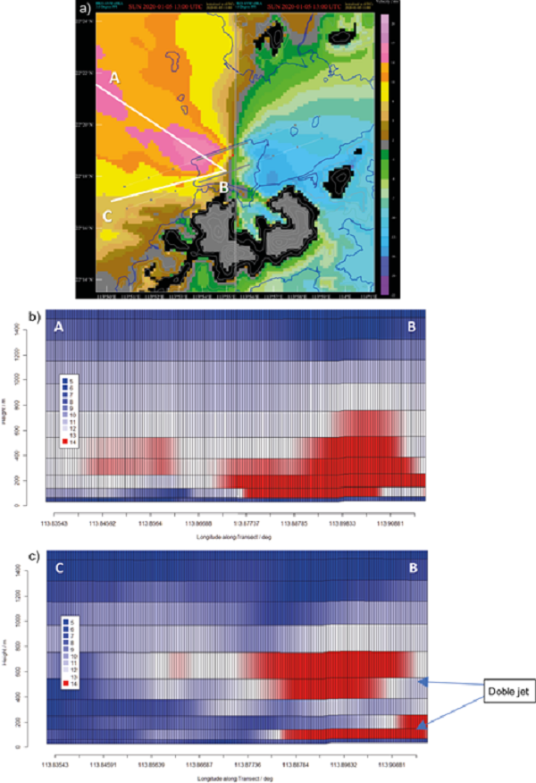 RESUMEN: Las corrientes en chorro en la capa límite atmosférica pueden provocar riesgos meteorológicos en el sur de China. En este estudio se documenta un cillazamiento del viento de bajo nivel vinculado con una corriente en chorro que puede impactar a una aeronave. Se analizan dos casos típicos del régimen del monzón del noreste: un chorro del este alterado por las montañas ubicadas al sur del Aeropuerto Internacional de Hong Kong, y el surgimiento repentino del monzón que provoca una corriente en chorro de bajo nivel del noreste. Los sistemas Doppler de detección por luz y distancia (LIDAR, por sus siglas en inglés) pueden captar las características de los cillazamientos de manera consistente con los informes de los pilotos y la información de vuelo. Son útiles para proporcionar avisos oportunos a las aeronaves. En este estudio en particular, el LIDAR capta una estructura de doble corriente en chorro en la capa límite atmosférica para un caso de viento del este, el cual no se había reportado antes en la literatura. El mecanismo físico que explica la presencia de una doble corriente en chorro aún es desconocido. También se estudia el desempeño de un modelo de predicción numérica del tiempo con alta resolución espacial (200 m) para pronosticar tanto la corriente en chorro como el cizallamiento de bajo nivel asociado. Se encontró que el modelo predice razonablemente bien las características del cizallamiento con algunas horas de anticipación y, en los casos estudiados, tiene capacidad para proporcionar alertas oportunas a las aeronaves.