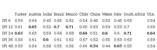 Figure 9 and Table II, which depict the existing relationships between DEPI and SPI at different time resolutions, offer a first sample of this contribution. There is generally a very good correlation between the values of both indices at all temporal resolutions, even when all the monthly values are included in the calculations, including the wet ones. The best correlations occur with SPI 36 or SPI 48 in series with a tendency to long dry runs registered with the DEPI, such as in Indonesia, China or Italy, and with SPI 6 for those with short ones like Australia. The other examples lie in between these two situations and show very good correlations between DEPI, and SPI 12 and SPI 24.