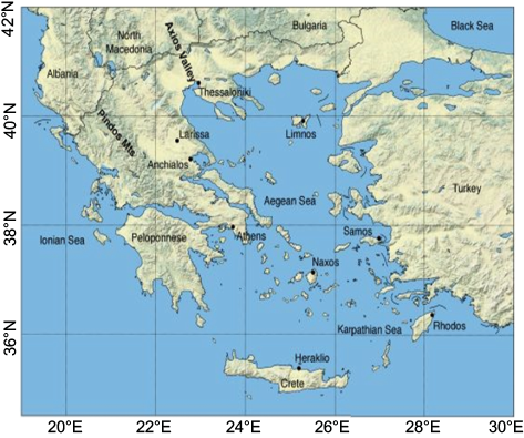 The data utilized in this study were provided by the Hellenic National Meteorological Service (HNMS) and are: (a) original meteorological observations from 1975-2015 of the international synoptic stations namely Limnos, Naxos and Iraklion (WMO code numbers 16650, 16732, and 16754, respectively); (b) the HNMS Daily Bulletin from June to September 1991-2000, and (c) ECMWF gridded output from ERA-Interim and the operational model at 13-km resolution.