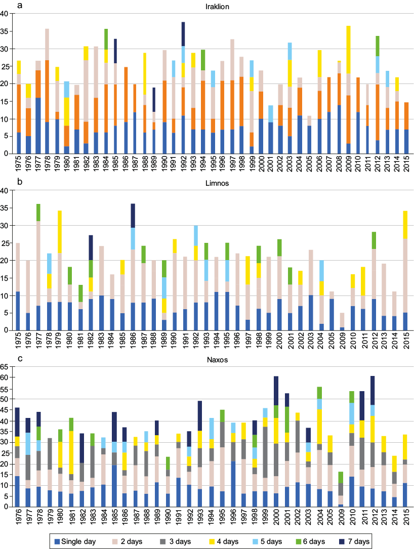 The frequency of occurrence of the type B Etesian days is illustrated in Figure 2, where it can be seen that the number of consecutive days comprising a spell of Etesian outbursts can be as high as seven in all of the three meteorological stations. The population for the occurrence of seven consecutive days with Etesian outbursts, is the smallest among the populations of one, two, three, four, five and six consecutive days of type B Etesian winds.
