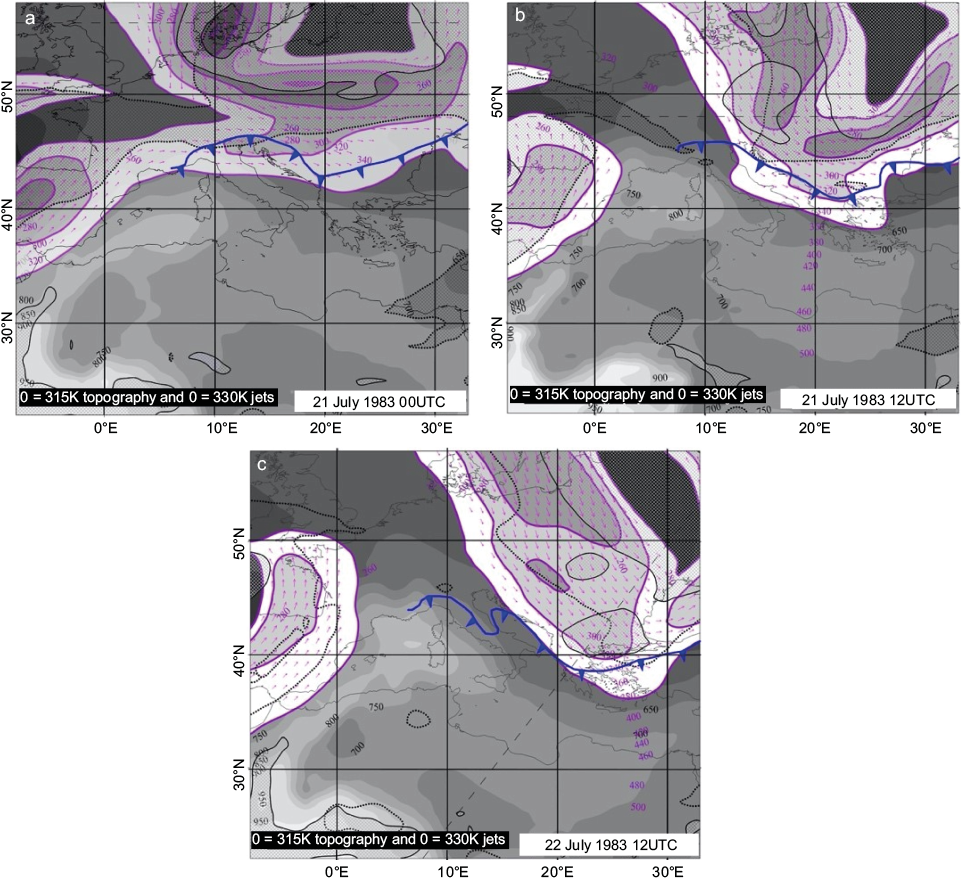 We start our analysis with the depiction of the topography of the 315 K isentropic surface at 00:00 UTC on July 21, 1983 (Fig. 3a). During the preceding days, the process altering the circulation index from high to low resulted in the formation of the blocking high over the British Isles. This extended northeastwards and the consequent evolution of downstream development (Prezerakos et al., 1999) resulted in a meridional orientation of the PJS, along the eastern flank of the blocking high. There was also a distinct jet streak northwest of the Balkans, which signals the accumulation of substantial eddy kinetic energy. In the same period, the occurrence of a tropopause folding with a satisfactory slope in the vicinity of the jet streak, resulted in a very cold stratospheric air mass, accompanied by high PV values, appearing towards the right entrance of the jet streak. The θ = 315 Κ surface, sloping downwards from north to south, extends from a height of 350 hPa just northeast of Scotland to 750 hPa over Egypt and 950 hPa over Northwest Africa. The lower the isentropic surface, the warmer the air. The concentration of the isobars (strong pressure gradient) of the θ = 315 Κ surface over the north Balkans, orientated almost parallel from west to east, clearly determines the position of the surface cold front. The θ = 330 Κ surface, on which the wind field is analyzed (see purple isotachs), lies below the level of the SJS over southern Greece and, therefore, it cannot be captured by the isentropic charts shown in Figure 3. The areas with PV of stratospheric origin are shown clearly on the θ = 330 Κ surface. Also, the jet streak, accompanied by a significant amount PV of stratospheric origin, is distinct and centered at 10º E, 55º N.
